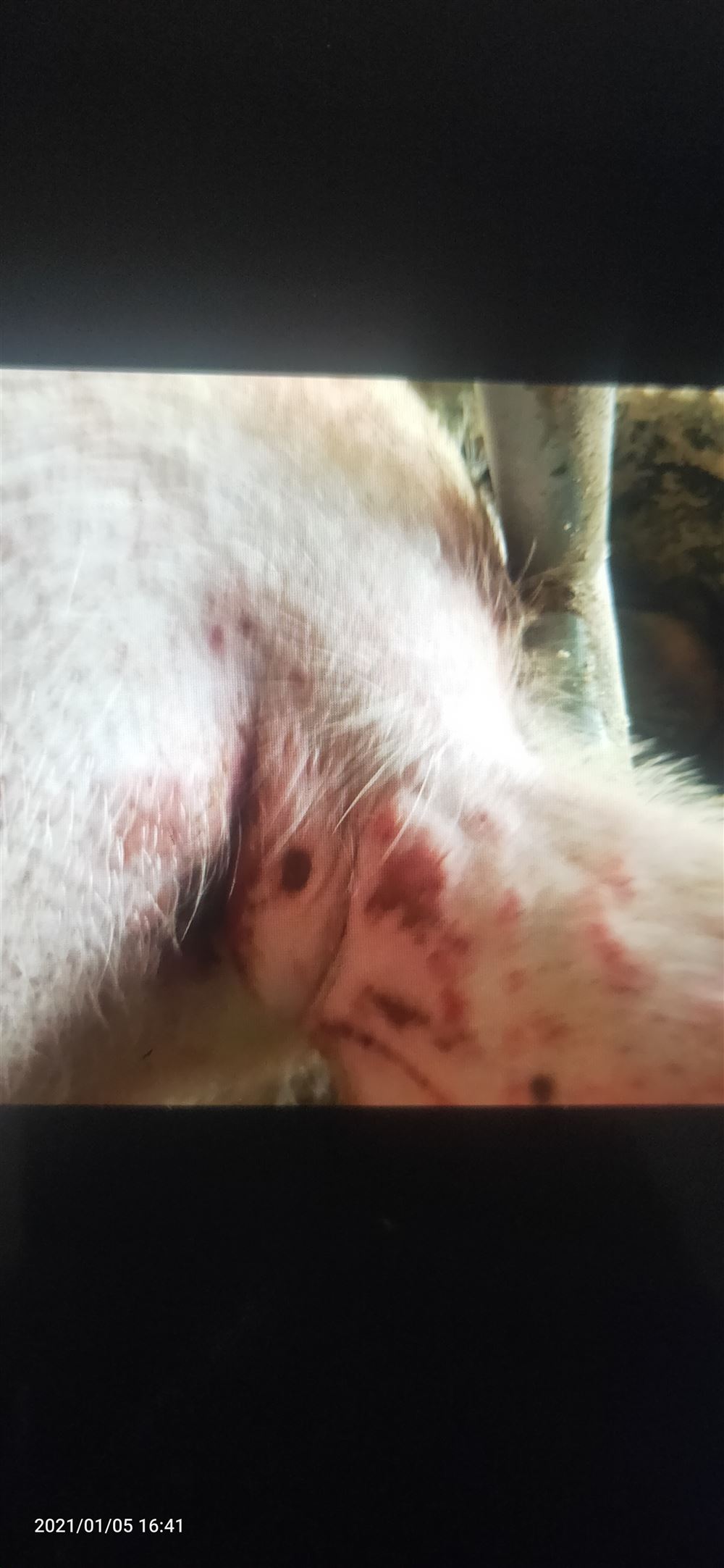 答:您好!通過您的描述與圖片顯示,如果母豬不蹭不癢的情情況下,那么初步懷疑為母豬抵抗力低下,環(huán)境不潔,消毒不嚴格等,繼而引起某些細菌感染,如金黃色葡萄球菌、波氏桿菌等感染。這里,需要強調(diào)的是,引起母豬抵抗力低下的原因眾多,營養(yǎng)因素缺乏、疾病感染、管理不當?shù)?。針對以上情況,首先應補充營養(yǎng),建議飼喂正規(guī)廠家飼料,合理調(diào)整飼喂量。同時,飼料中加入豬專用維生素--碩維鍵,每100斤飼料中加入100克,同時,加入利高-44,每100斤料中加入100克,連續(xù)飼喂2-4周。對于患病嚴重者,可肌注得米先(長效土霉素注射液),每10公斤體重1毫升,一針藥效3-5天。皮膚外用魚石脂或百勝-30消毒液涂抹,每天上下午各一次,連用5-7天。清潔環(huán)境,帶豬消毒。消毒可以選擇百勝-30,按照1:200--400,每3天一次消毒。