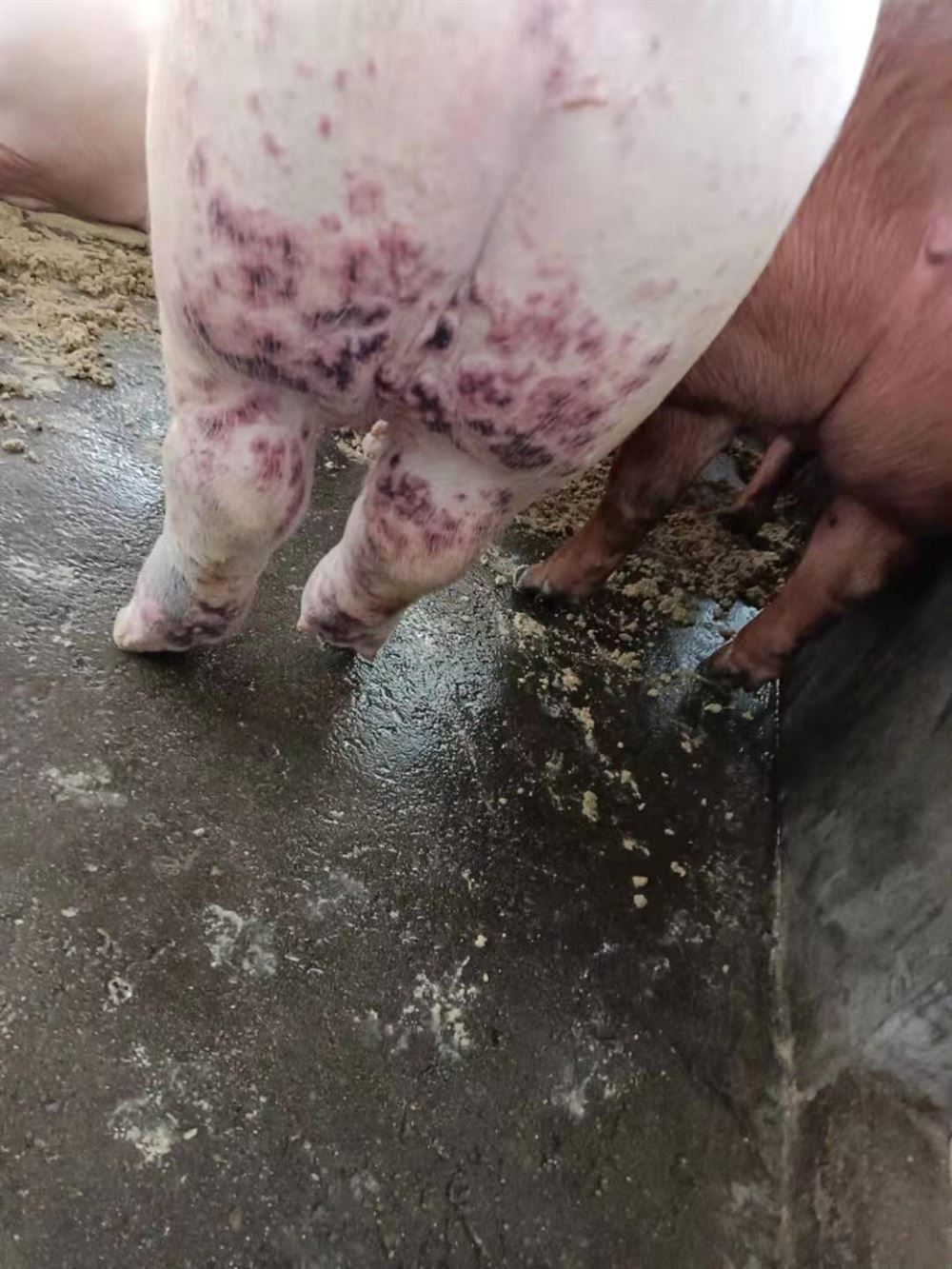 答:您好!由上圖分析,疑似豬皮炎腎病綜合征(PDNS),其與感染2型圓環(huán)病毒(PCV-2)有關(guān)。此病多發(fā)于20~65kg 的育肥豬, 在豬體的后軀部呈現(xiàn)成片的出血性丘疹、慢慢開(kāi)展成深褐色至黑色的厚痂,往往先是中間黑再向外擴(kuò)展。,極少見(jiàn)到全身皮膚呈現(xiàn)丘疹或厚痂的景象。